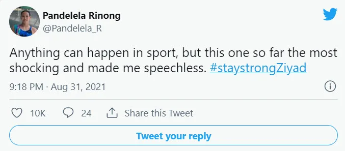 “Anything can happen in sport, but this one so far is the most shocking and made me speechless. #staystrongZiyad,” she tweeted.