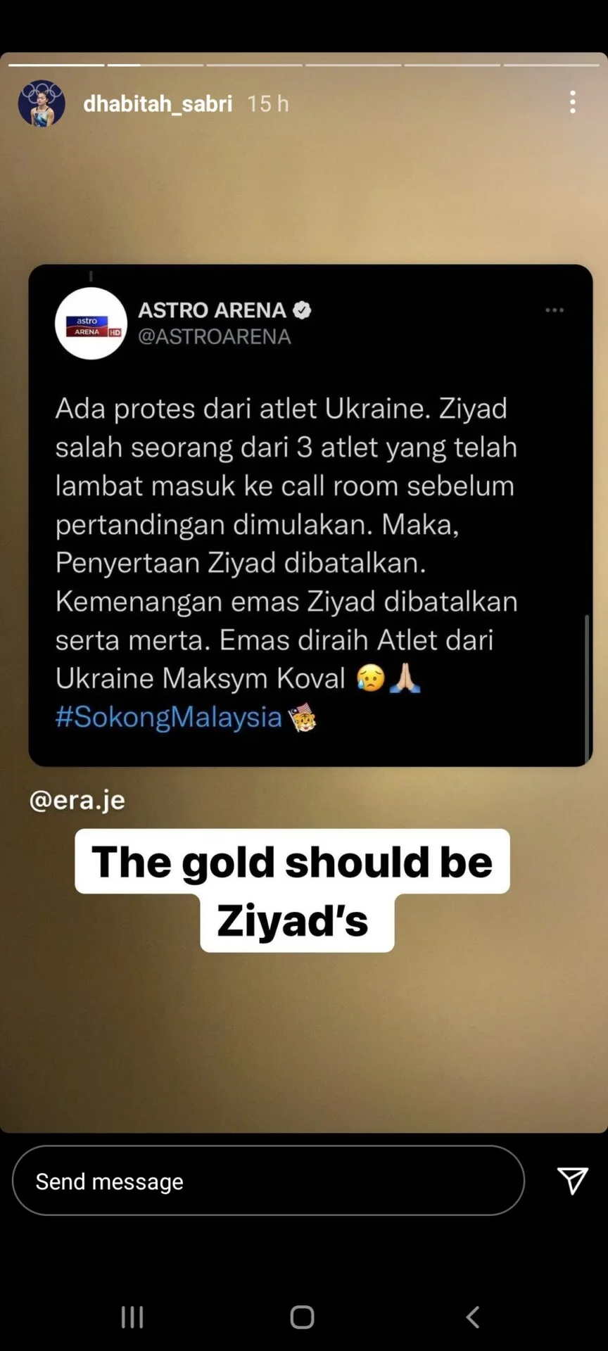 National diver, Dhabitah Sabri, in her Instagram story, said, “The gold should be Ziyad’s.”