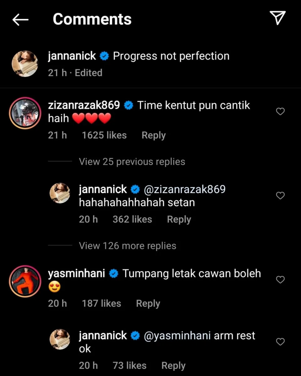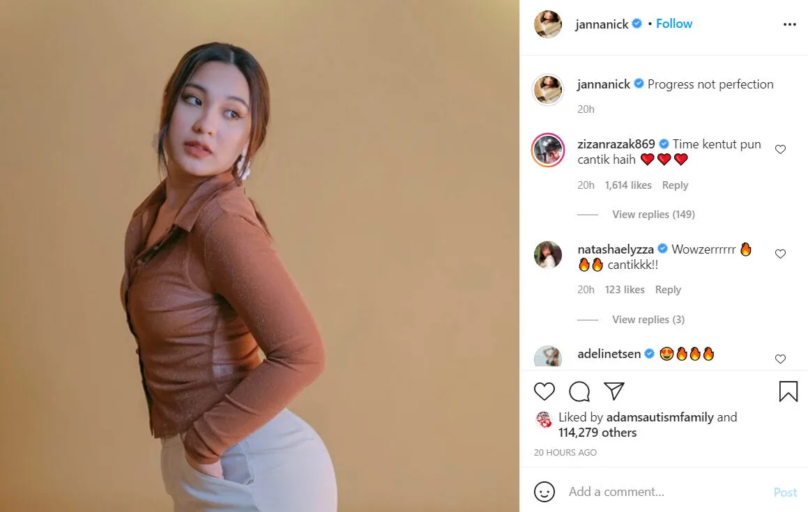 Aside from the naughty comments from netizens, the posting that was captioned with “Progress not perfection” also stole the attention of popular comedian Zizan Razak. He managed to tease Janna by equating the actress’s standing pose as if she was farting.