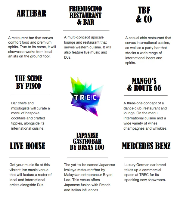 TREC aims to assimilate a variety of different atmospheres through its 5 zones that offer an eclectic mix of fine dining, indie cafes, pubs, clubs and lounges, attracting both local and international patrons.