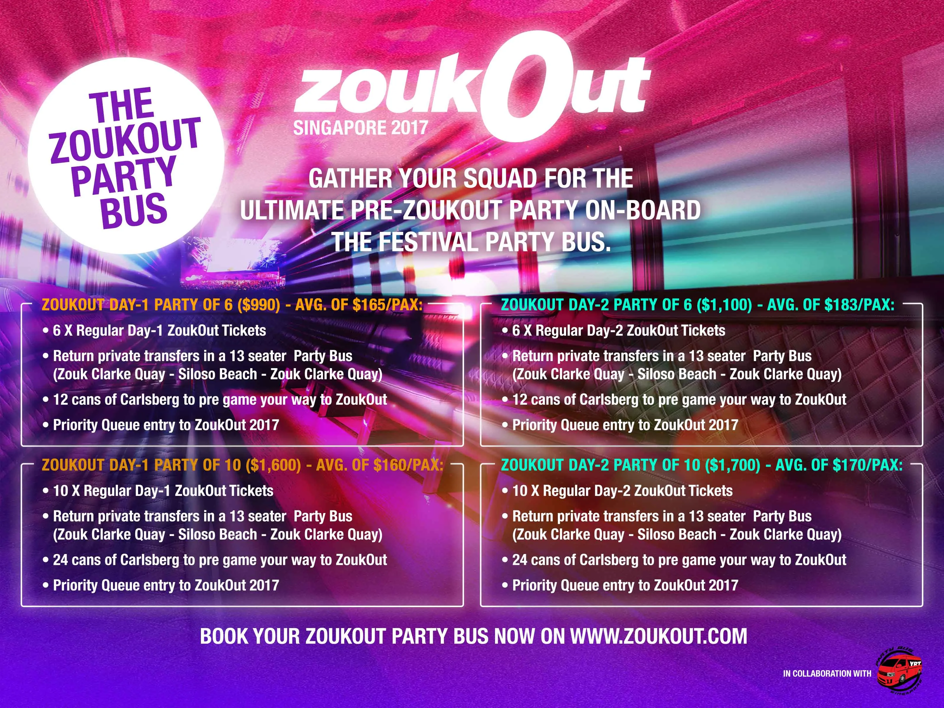 Oh yum. That’s just about every excuse to start your festival journey early! Hop on-board the ZoukOut party bus and pre-party with your squad on-board the festival party bus from Clarke Quay to the festival and after-party back to Clarke Quay.