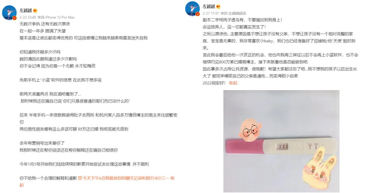On 27th January, Yueyue took to Weibo to air her grievances about her husband. “(We’ve) had countless disputes and countless times of forgiveness,” she wrote. “(Although we’ve) been together for more than a year, (it’s) full of disappointment.” Yueyue explained she had suspected her husband had been cheating on her for a while now. Although she convinced herself they were simply friends, another occurrence proved her wrong. Apparently, her husband was consistently meeting a male blogger from Hangzhou. Yueyue shared that the blogger was already married and had over 8 million followers.