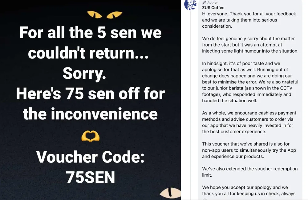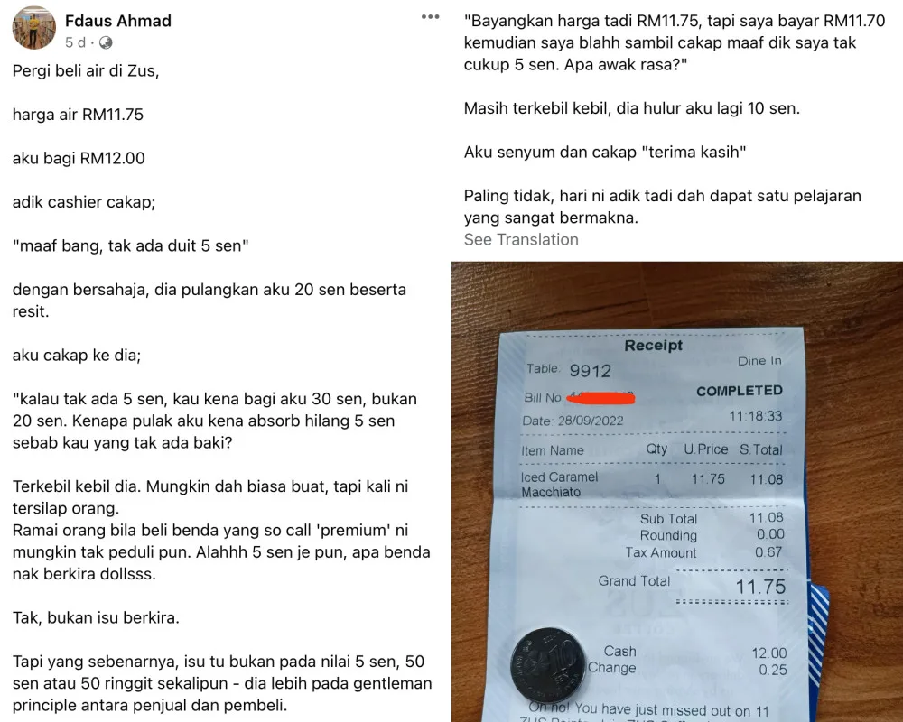 This time around, a man by the name of Fdaus Ahmad, expressed his disappointment with ZUS Coffee on Facebook when they short-changed him of 5 Sen. After buying a RM11.75 coffee, the staff on-hand were unable to give him his exact change, so they short-changed him. After the Facebook posting went viral, a statement from ZUS Coffee further outraged netizens.