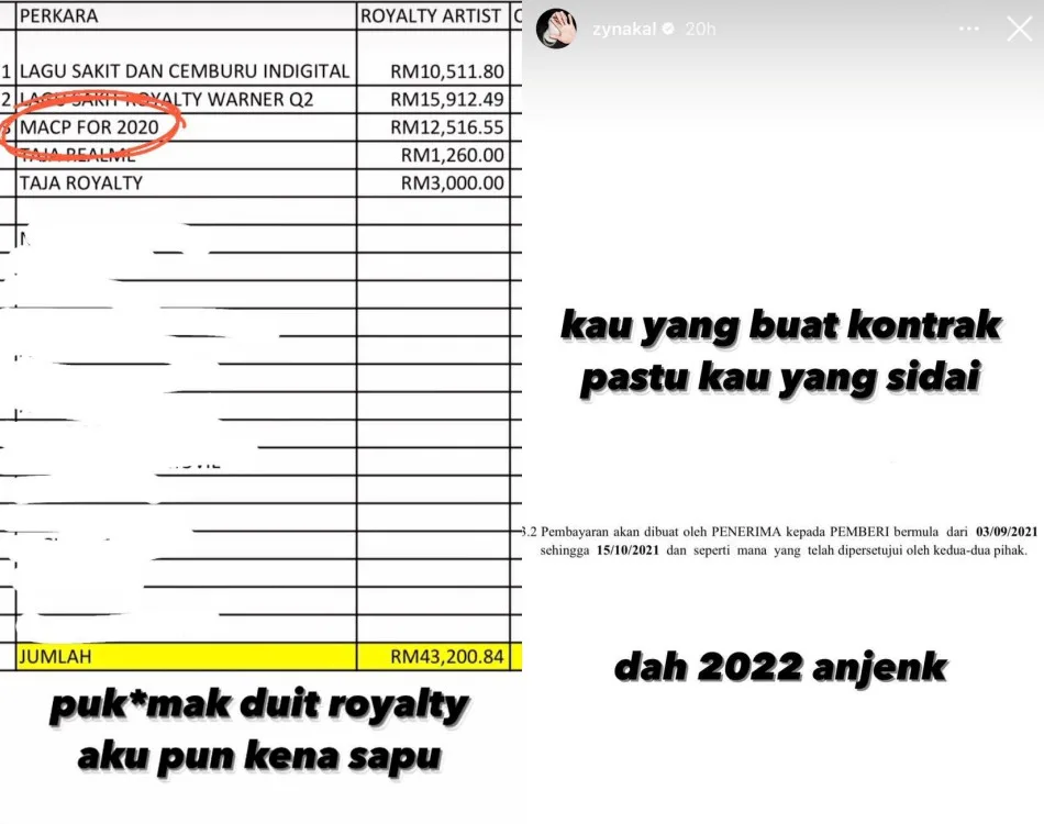 Not only that, it appears that his royalty amounting to RM12,516.55 obtained from the Music Authors Copyright Protection (MACP) for the year 2020 had also vanished. Zynakal wrote,“You were the one who signed the contract, and you’ve been leaving me hanging. It’s already 2022, anjenk!”